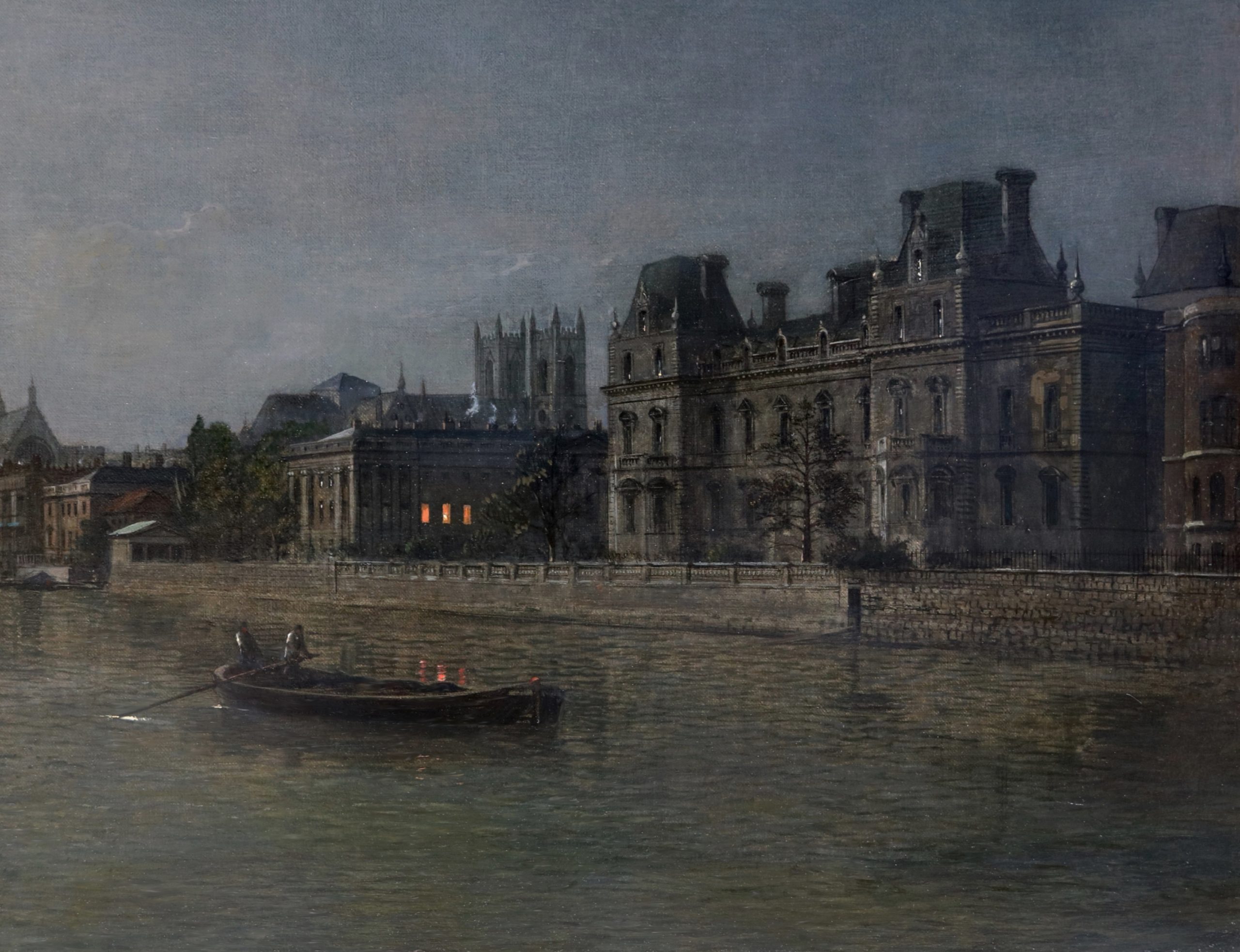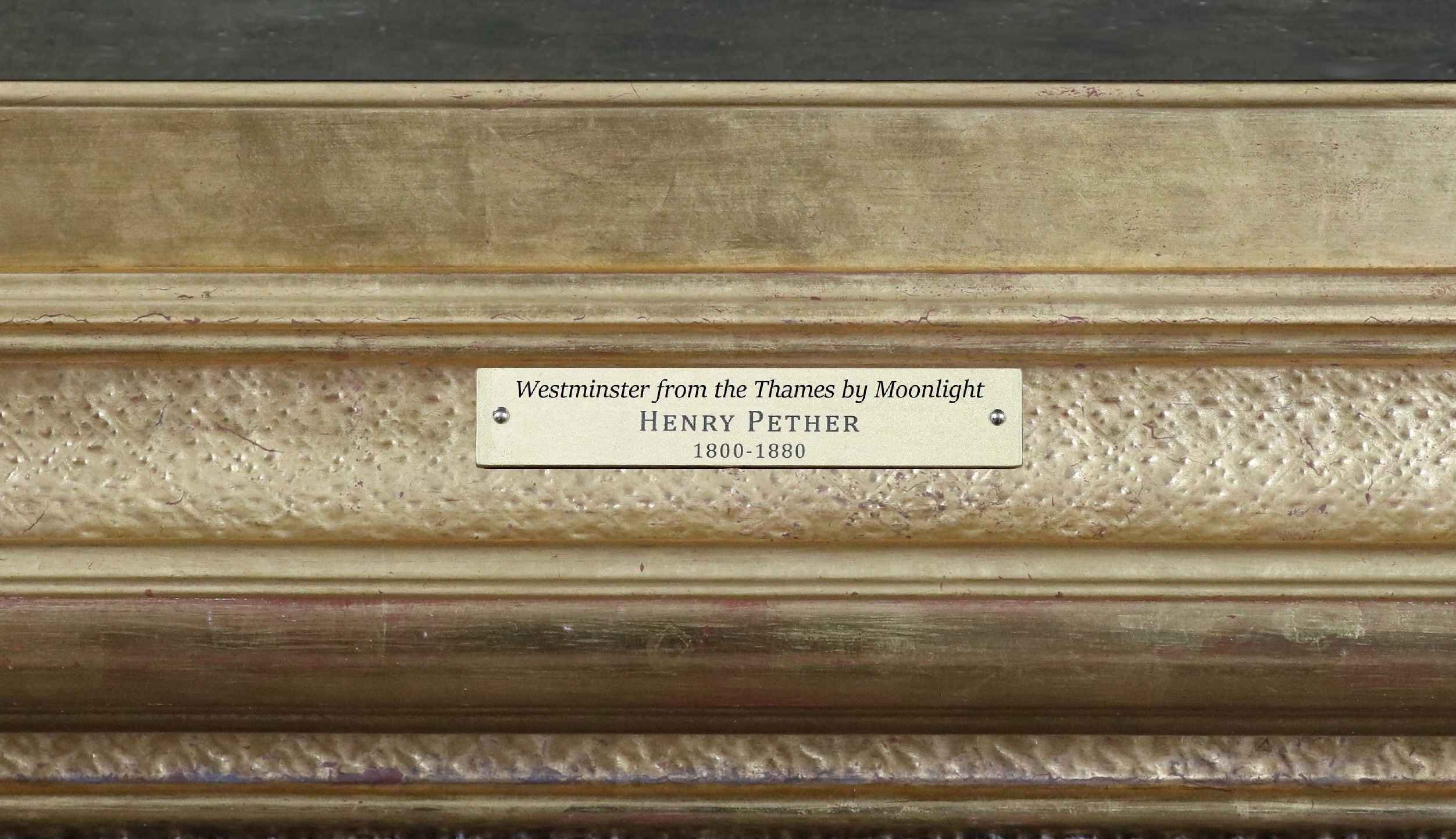 The height and colour of the full moon tells us this is a nightscape of early summer; the Great Clock gives the time as twenty minutes to midnight. Although the new bridge and Palace of Westminster were both operational by 1862, construction of the new Victoria Embankment was not begun until February 1964, indicating Henry Pether painted the current work in the summer of 1863, the year in which the Great Clock began striking the hour.
