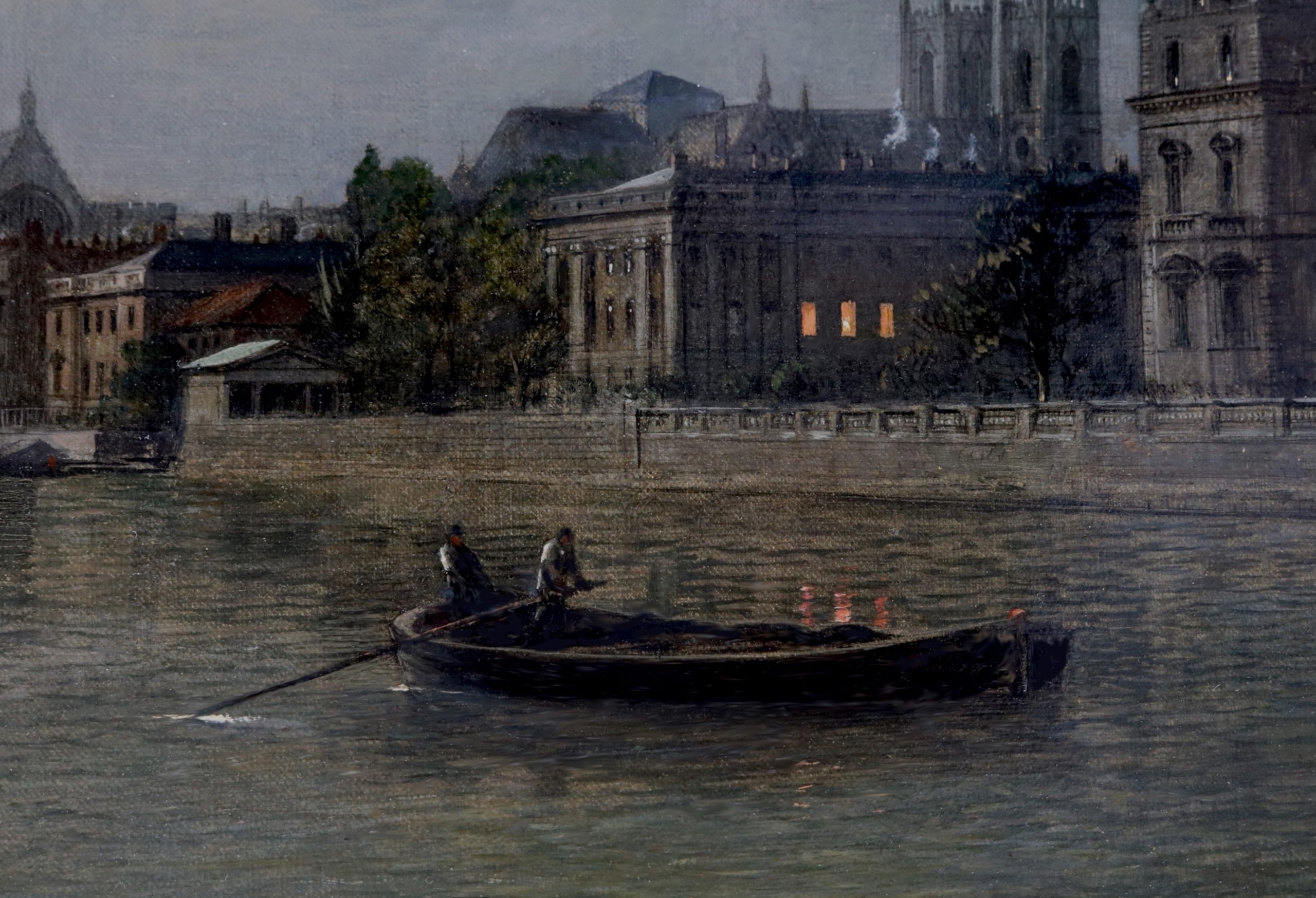 The painting - one of the artist’s finest views of London in the 1860s - depicts the Houses of Parliament, the tower of Big Ben, Westminster Abbey, and the old foreshore as seen from the Thames.