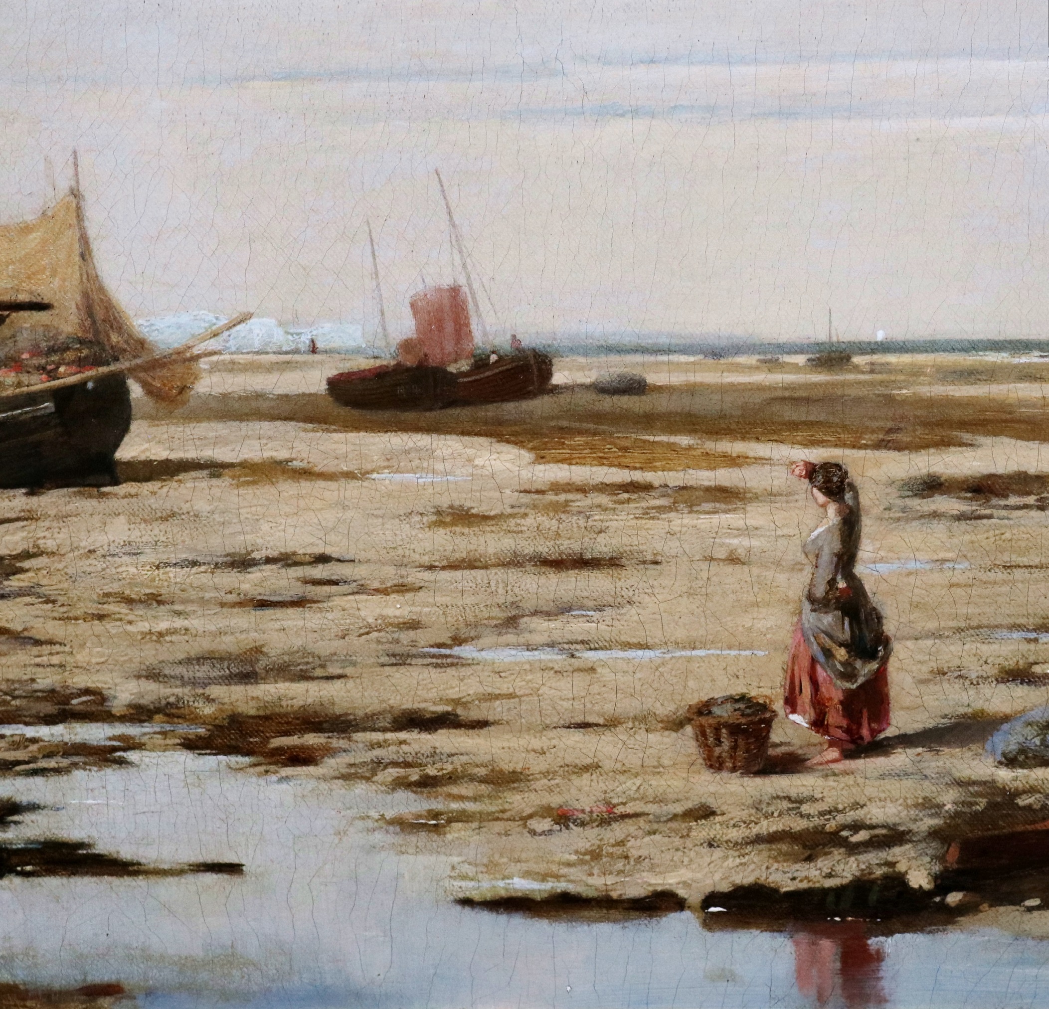 The title of the painting refers to both the shape of the beach – which resembles the tail of mermaid - and to the young fish seller with the creel basket waiting by the newly landed boats hoping to have first pick of their catch. Throughout the 18th and 19th century, when local girls left school, they would be given a woven willow basket by their mothers and begin their working lives selling fish. As well as buying from market, girls would also wait on Mermaid beach for the fishing boats to return at dawn. Today, it is considered to be one of the most picturesque sands on the South Coast of England.